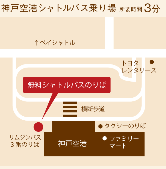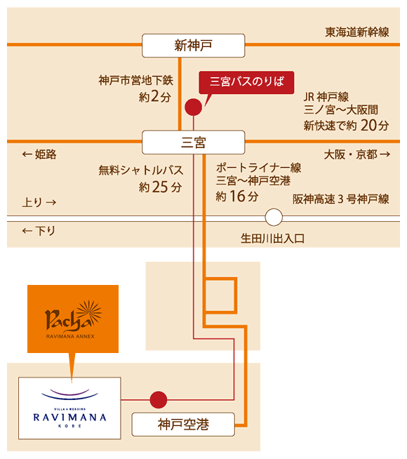 各線三宮駅(JR/阪急/阪神/地下鉄)からポートライナーへ乗り換え、「神戸空港駅」までお越しください。神戸空港駅からはラヴィマーナ神戸行きの無料シャトルバスご利用ください。
