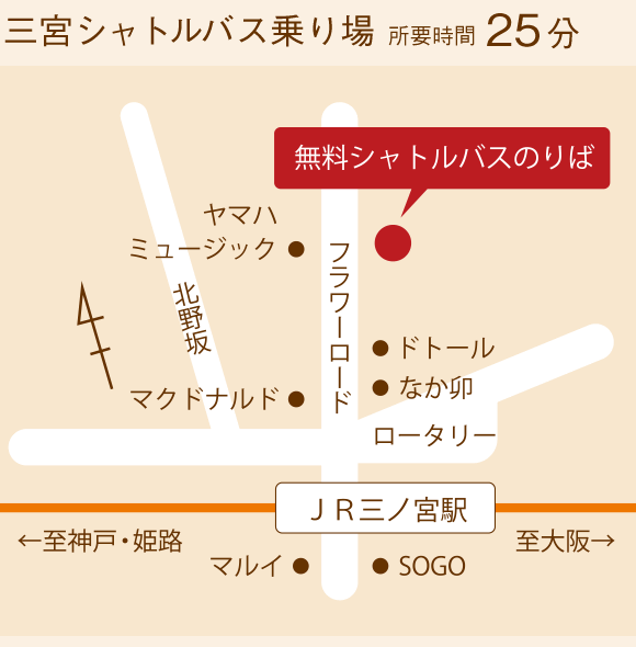 各線三宮駅(JR/阪急/阪神/地下鉄)から北側(山側)へ徒歩約2分の所に、ラヴィマーナ神戸行きの無料シャトルバスのバス停がございます。